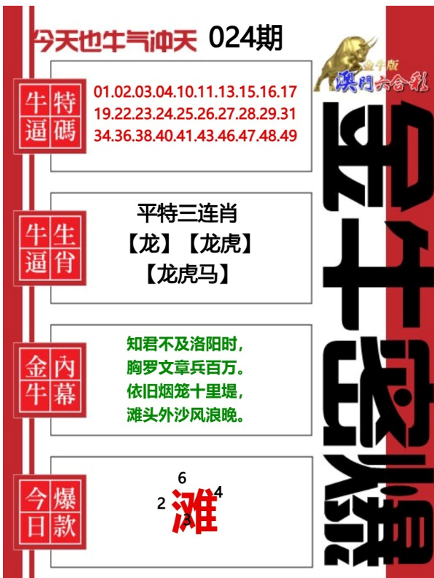 琅琊【琅琊通晓天下事】(016期) 【琅琊天下事】个人心水,仅供参考! ------------------- 琅琊①:十二楼台春色满 (解:春肖:兔虎龙) 琅琊②:三千世界岁华浓 (解:五福肖:鼠虎兔蛇猴龙) ------------------- (主要心水) 特九肖【牛虎狗猪兔蛇马龙鼠】 特四肖【牛虎狗猪】 挑特18码:05.17.04.40.08.20.07.19.03.15.01.49.24.36.02.14.30.42 主博九码:05.17.04.40.08.20.07.19.03